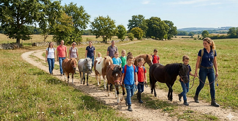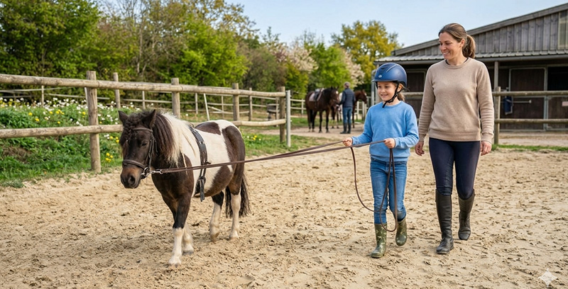 Chaque enfant devient le guide de son poney à pied et doit lui transmettre les bonnes informations pour le mener sur un parcours. Il apprend alors à diriger son poney en toute sécurité tout en développant une communication fine avec l’animal.