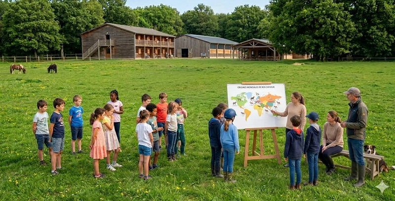 Les enfants vont appréhender la géographie et l’histoire à travers celles du cheval en découvrant les races mais aussi les progrès techniques permis par l’utilisation du cheval depuis le Moyen-Âge avec, comme professeurs, des poneys et chevaux bien sûr !