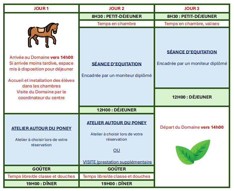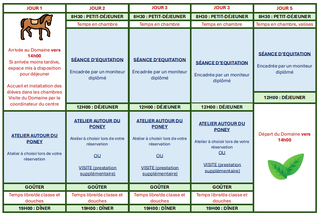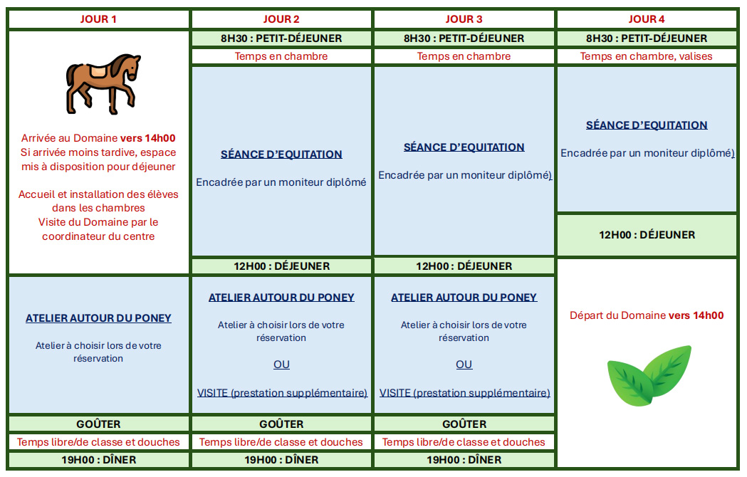 Cette classe de découverte invite les élèves à rencontrer les poneys et les chevaux, à les préparer, les monter et les soigner. Encadrés par des moniteurs diplômés, les cours se déroulent dans une ambiance familiale afin que les enfants prennent confiance en eux et apprennent de manière ludique !