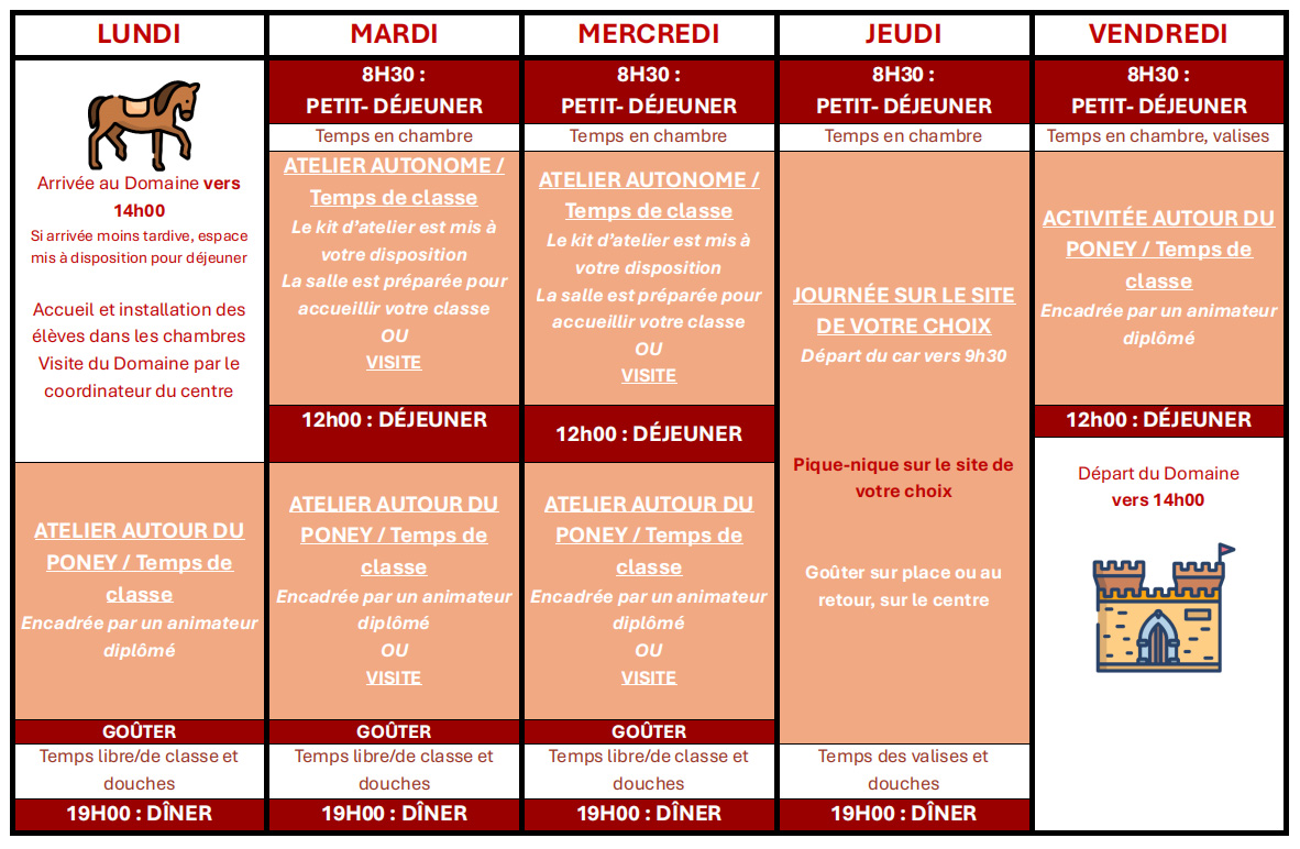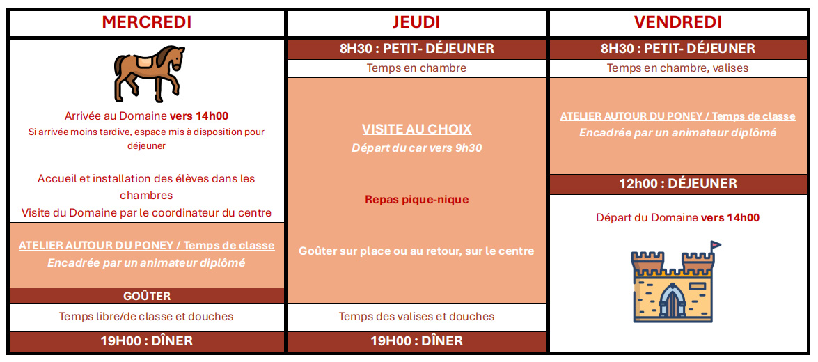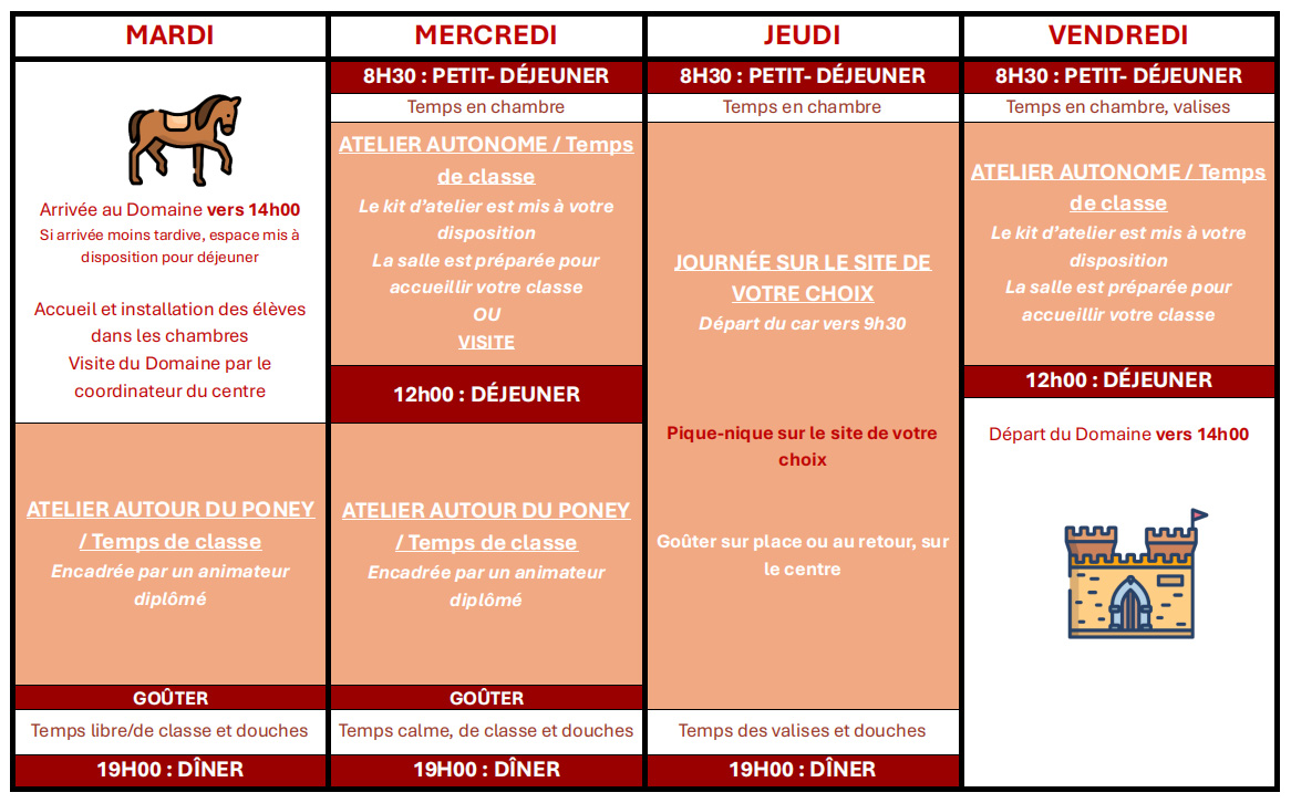 En parallèle des cours d’équitation, des ateliers médiévaux vous seront proposés en autonomie. Les supports pédagogiques vous seront envoyés avant votre arrivée et lors de votre séjour, notre équipe vous préparera votre salle avec tout le matériel nécessaire pour mener à bien votre activité.
